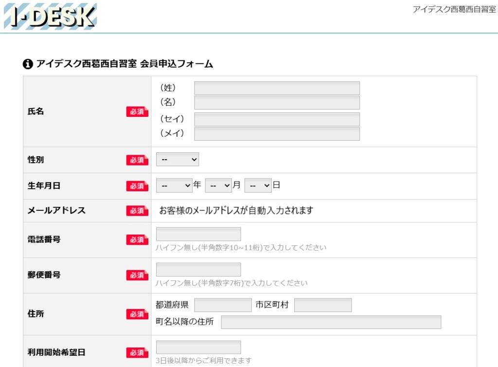 ④会員申込フォーム内の各項目をご入力、希望コースのご選択、ご本人確認資料のアップロードをお願いします。