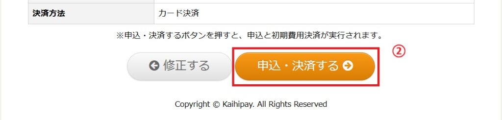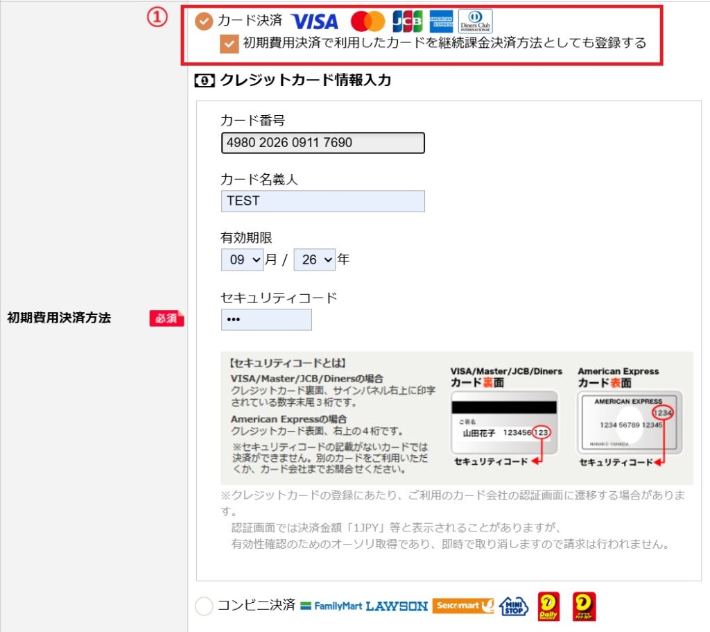 ①[初期費用決済方法]でカード決済を選択し「初期費用決済で利用したカードを継続課金決済方法としても登録する」にチェックを入れカード情報をご入力ください。
