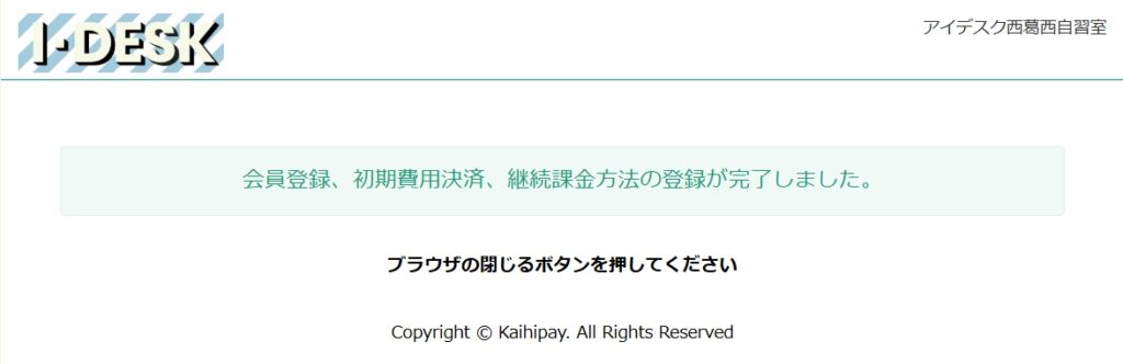 ④「会員登録・初期費用決済、継続課金方法の登録が完了しました」という画面となり申込完了です。