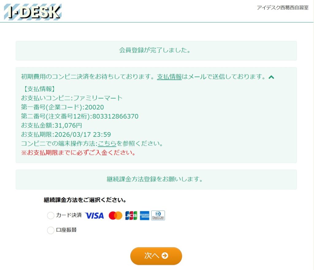 ③「会員登録が完了しました」という画面となり申込完了です。コンビニの支払い情報をご確認ください。